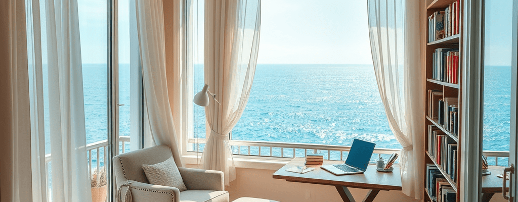 Of course, even in this idyllic setting, potential distractions could arise. The calls of seabirds or the distant laughter of beachgoers might momentarily pull me away from my work, though these sounds would be welcome interruptions—a reminder of life’s vibrant energy just beyond my window. I’d also have to resist the temptation to spend too much time lounging in the hammock instead of writing.