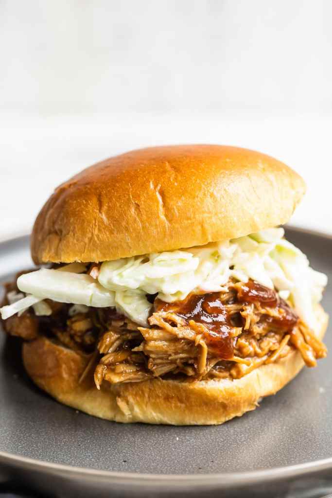 - Shred the pork with two forks and put it back into the slow cooker along with about 3/4 cup of the reserved liquid and the BBQ sauce (for every 3 oz cooked pork, I used 2 tbsp BBQ sauce).